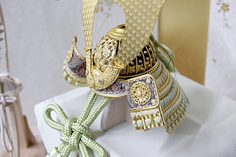 毛バタキと白手袋のお手入れセットを進呈します。五月人形を飾ったりするときは、手袋をご使用下さい。収納するときは、毛バタキで十分ほこりを払ってからおしまい下さい。